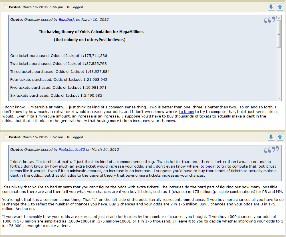 As you can see, Google’s autocomplete function tells us that a lot of people who can’t spell “halve” have done a similar search. Initially, I simply found this amusing. Little did I know that this would be pretty indicative of most of the results pages that I would find, which were largely comprised of threaded discussions in which deluded lotto addicts who are convinced they will find “the system” for winning butted heads with people with a decent understanding of math who would condescendingly tell the former what idiots they were, without ever actually providing a thorough explanation. One of the more terrifying of these threads goes on for some thirteen pages.